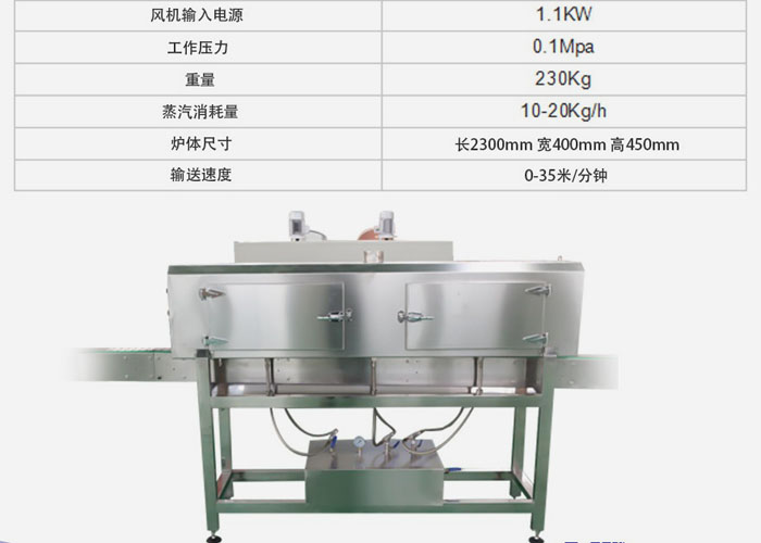 新型的熱蒸汽收縮機能夠應對不同瓶型進行平順收縮。低壓蒸汽鼓的分布和蒸汽噴射的路線都通過無縫管,是一致的。噴嘴被分成三段,并且每一段的高度位置和蒸汽輸出可以進行調節,以達到良好的收縮效果。整臺機器由不銹鋼制成,所包含的保溫層不僅節約了能量,也遵守了國際安全標準。不銹鋼接水盤負責收集冷凝水。整機采用防水設計,操作便捷簡單,保養費用較低。在原有結構上,增加雙層保溫爐,更加節能。