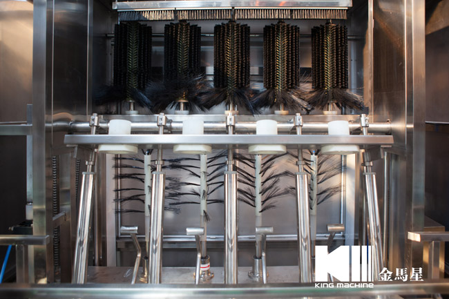 本設備集合了消毒、沖洗、灌裝和壓蓋,合四為一,能夠實現全自動桶裝水旋蓋。沖瓶機使用多種沖品液和消毒液,以保證獲得沖瓶和殺菌效果。消毒液可以循環使用,節省消耗。