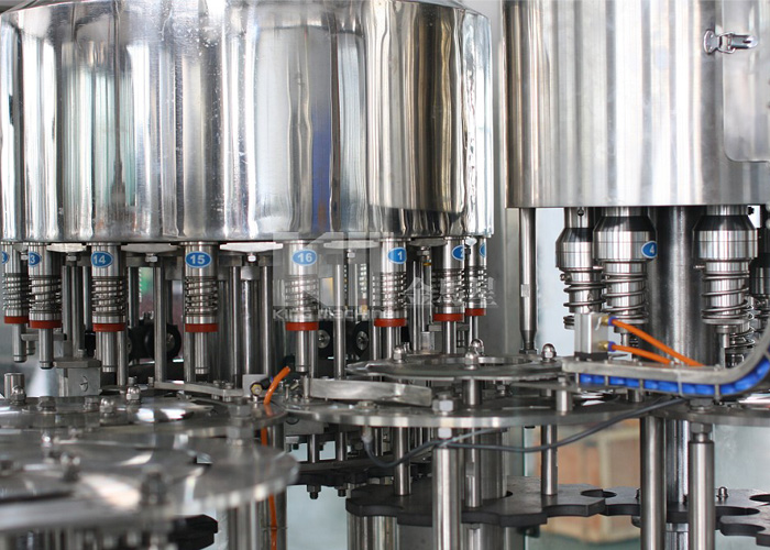 2.接下來,瓶子旋轉回正,限瓶器打開,瓶子被傳送到進瓶輪上進入到灌裝部分。灌裝機上有光電檢測傳感器,當瓶子通過時,數據會傳送到PLC,PLC直接命令機器的啟停。