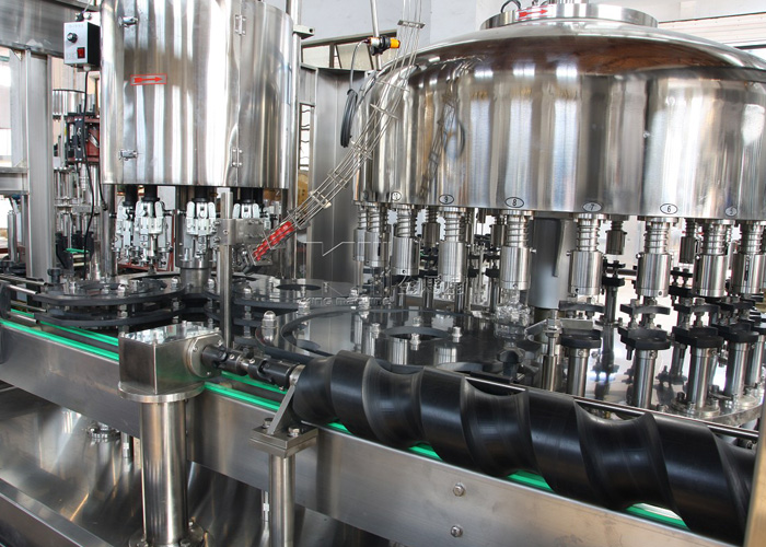 從沖瓶系統過來的瓶子經撥瓶星輪撥至灌裝系統的托瓶頸裝置上,并隨回轉底座順時針旋轉,瓶托沿凸輪導軌上升將空瓶托起,在托瓶頸裝置里的彈簧力作用下瓶口與灌裝閥閥座封嚴,然后開始灌裝。灌裝分為四個過程:開閥進氣、進液回氣、液滿關閥、放氣回位。灌裝完畢后,實瓶開始下降至起始高度,然后由灌裝封口轉瓶機構的撥瓶星輪沿弧形導瓶板送至封口機構,進行封蓋。