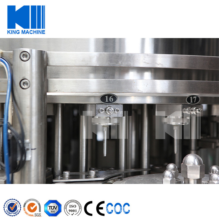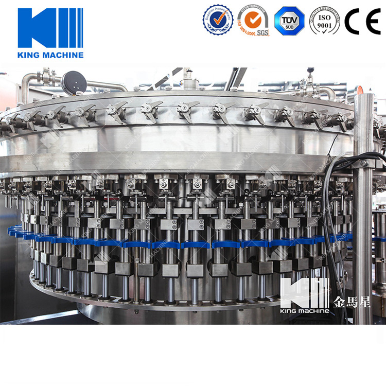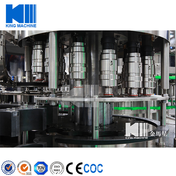本設備主要用于含汽飲料灌裝,包含沖瓶灌裝和旋蓋三大主要功能。本設備實現全自動運行,能夠適應PET瓶含汽果汁、含汽礦泉水及可樂與雪碧等灌裝。瓶型適應性強,更換瓶型時操作簡單快捷。灌裝方案中采用了等壓灌裝原理,灌裝快速穩定,液位準確,含汽量足。與同類設備相比,本公司產品產量高,運行穩定安全,故障率低,自動化長度高,價格經濟實惠。全機采用優良可編程控制器(PLC)來控制設備的自動運行,送瓶系統由變頻器改變速度,更加穩定可靠。每個部分都有光電單元進行監測,所以更加自動化,操作更加便捷。在此基礎上,更換灌裝單元即可改變灌裝模式到低壓真空灌裝和等壓灌裝等。本設備是飲料企業的選擇。