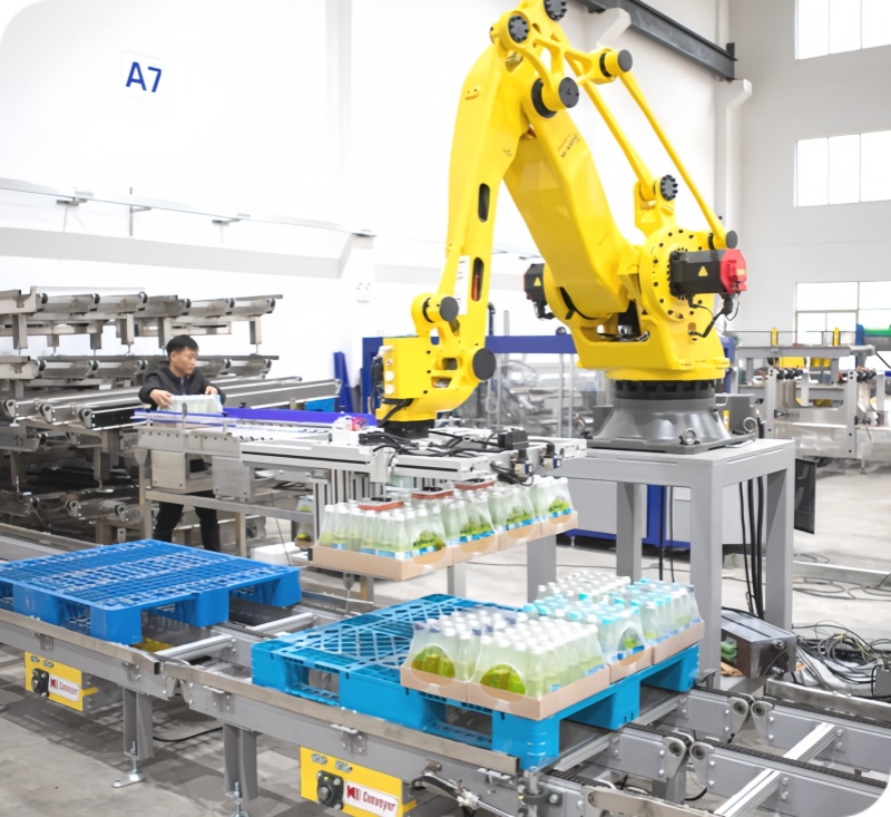 本機器人碼垛系統僅適用于20-25包/分鐘的液體灌裝包裝線碼垛。